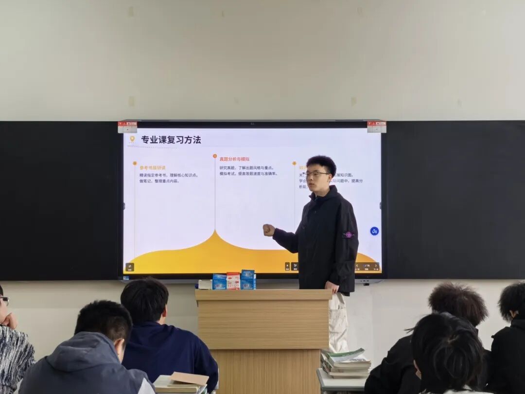 在经验分享会的最后环节,王奕达老师紧扣“院校选择、备考规划、心态调节、跨专业攻略”四大核心模块,进行了全面、深入地讲解。他重点强调了日常知识积累与系统性专题复习的关键作用,并结合实际案例,为同学们提供了切实可行的备考建议。