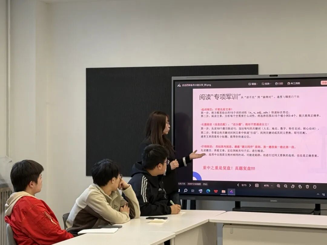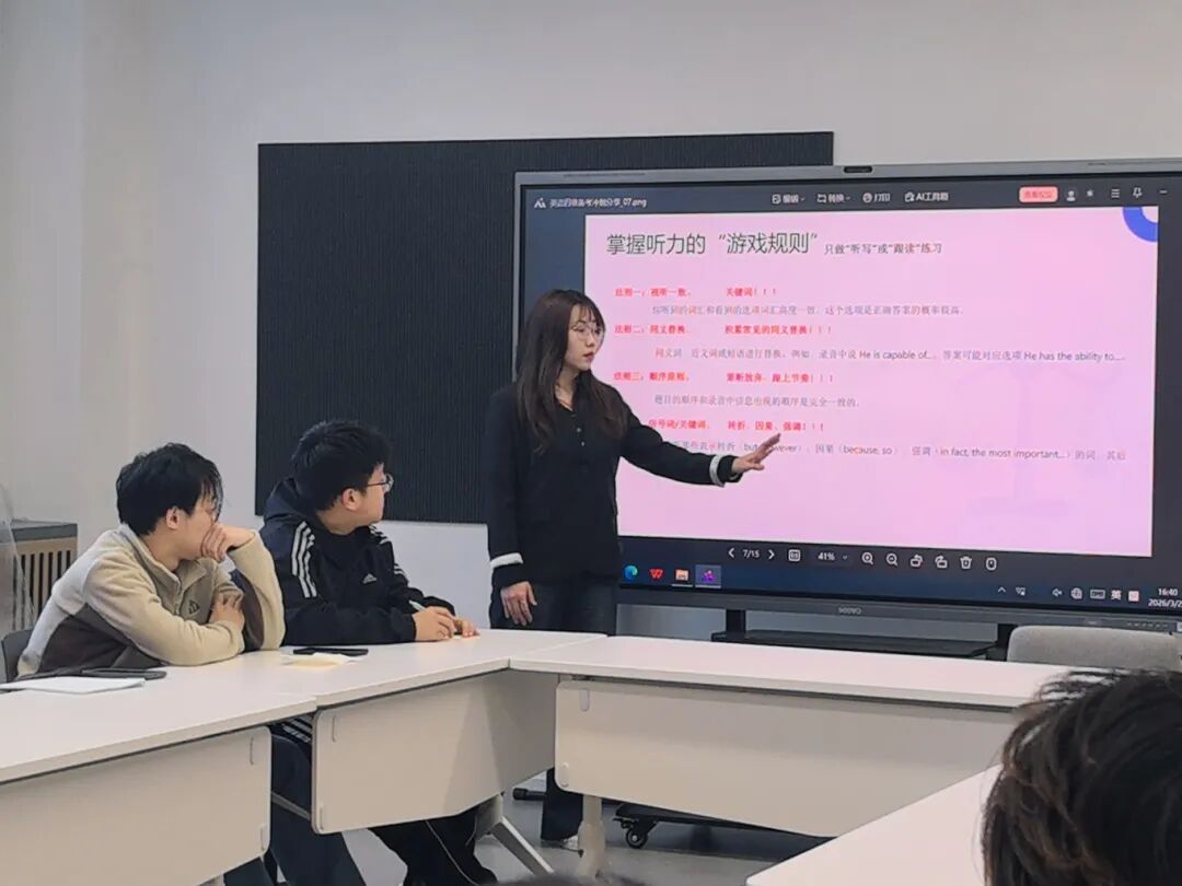 分享会上,张莹老师围绕四级考试的题型结构、复习策略与时间规划等方面展开系统讲解,结合自身带班经验与历年考试动态,针对学生在听力、阅读、写作与翻译等模块中常见的难点问题进行了细致剖析。她通过典型例题分析、备考资料推荐以及科学复习方法的示范,引导同学们在有限时间内实现高效备考。在互动环节中,张莹老师逐一解答学生提出的疑问,结合不同基础学生的实际情况提出个性化建议。理论讲解结束后,现场组织学生进行了模拟试卷练习,通过实战演练进一步巩固所学技巧,检验阶段性学习成果,现场秩序井然,学习氛围浓厚。