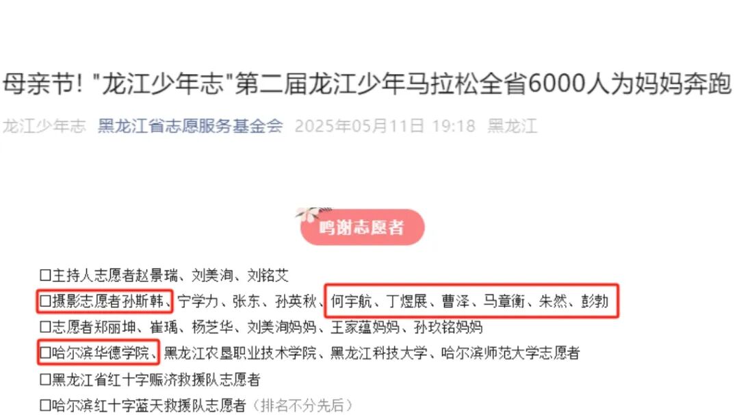 为深入践行新时代青年思想政治引领工程,厚植社会主义核心价值观培育沃土,在省委社会工作部指导下,由省志愿服务基金会联合省青少年发展基金会主办的“为妈妈奔跑·‘龙江少年志'第二届龙江少年马拉松公益慢跑暨‘困境少年成长计划’爱心加油行动”于5月11日母亲节当天,在哈尔滨音乐长廊庄严启动。哈尔滨华德学院“新时代先锋”宣讲团80余名师生志愿者以青春担当全程护航,共同助力这场充满母爱情怀的活动盛典。