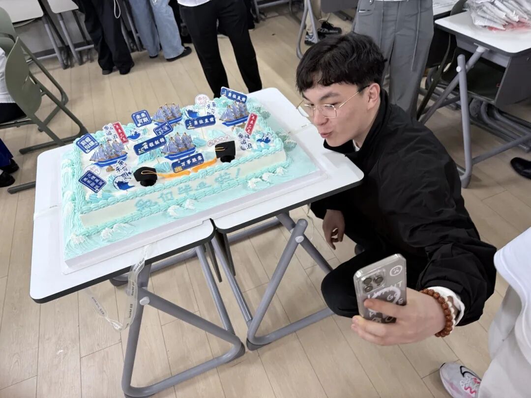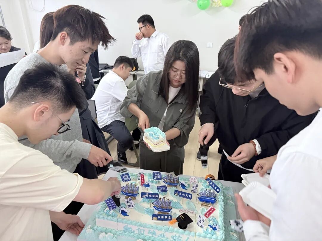 同日,温馨的“学”成有礼,“诞”生新程主题蛋糕分享活动上演。学院定制的毕业蛋糕缀满“勇往直前”“未来可期”等祝福字样,毕业生们在切分蛋糕的甜蜜与欢笑声中,互赠毕业寄语、拥抱惜别情谊,让校园时光的温暖化作奔赴新途的力量。