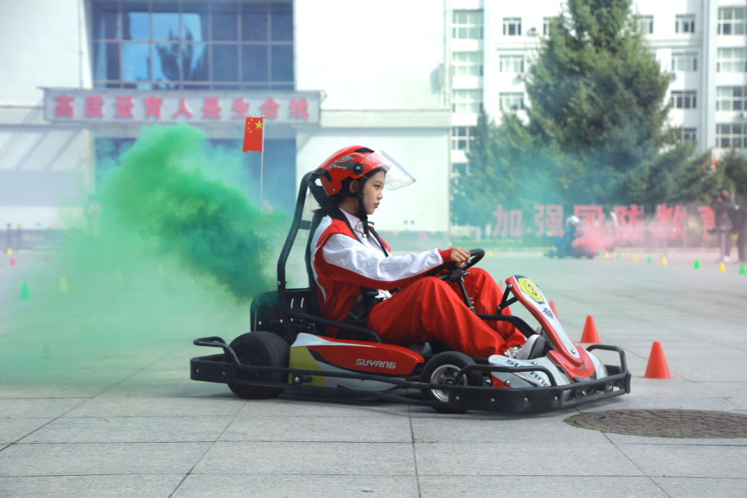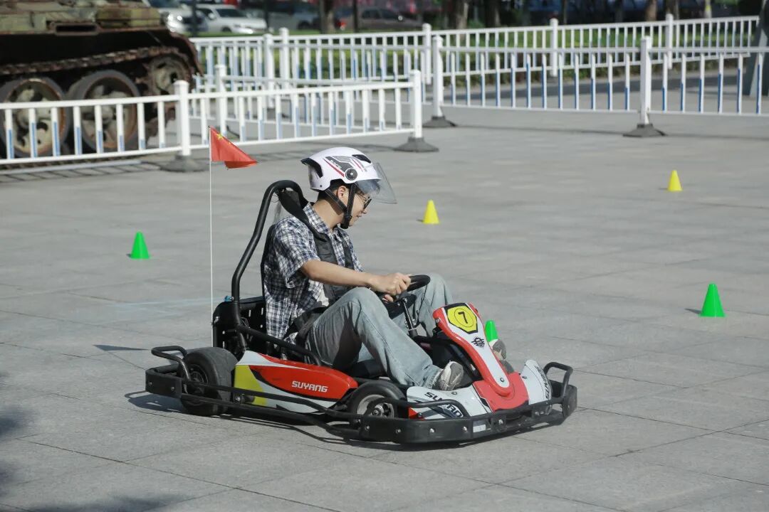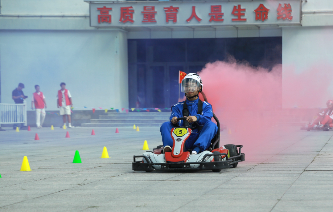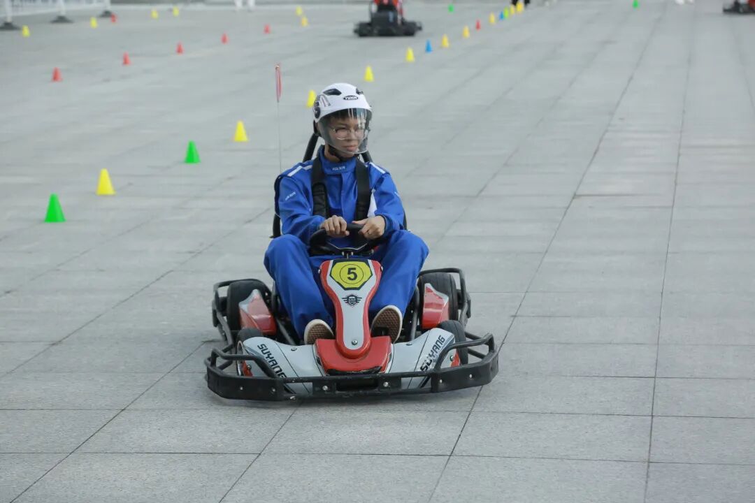 理论学习结束,真正的快乐才刚刚开始!头盔一戴,装备齐全,同学们化身“赛车手”依次上场。引擎轰鸣,心跳加速,一辆辆卡丁车如脱缰小马般冲出起跑线。风声呼啸、欢呼阵阵,每一次过弯、每一次加速,都是技巧与勇气的完美融合。有人一路领跑,有人紧追不舍,整个赛场瞬间变成欢乐沸腾的竞速场。