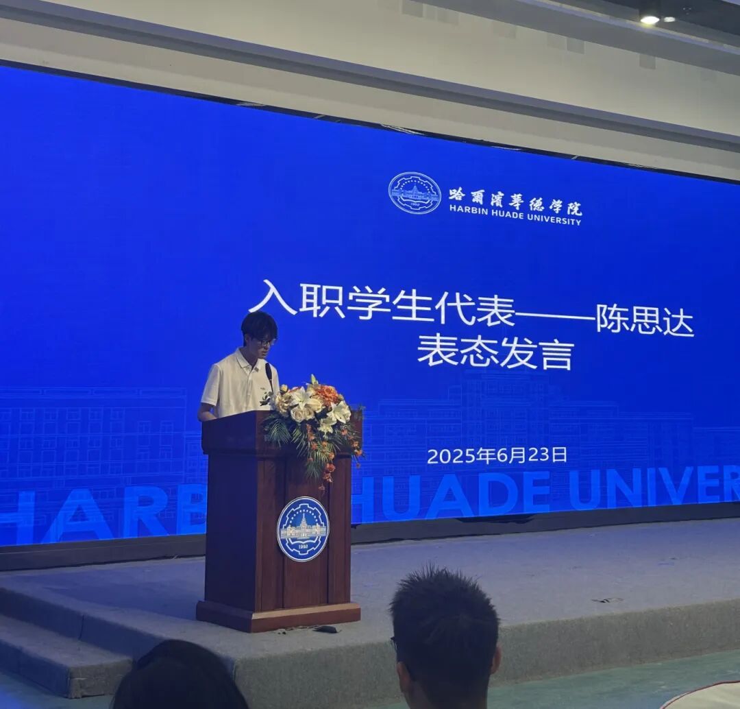 汽车与建筑工程学院陈思达同学代表即将入职的全体学生庄严承诺:“将以归零心态学习、以奋斗者姿态实干,让华德人的名片在吉利舞台熠熠生辉!”