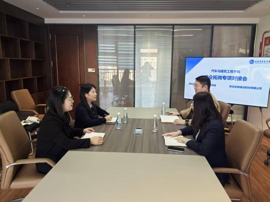 1月12日,汽车与建筑工程学院副院长刘玉丁、土木工程系副主任李欣一行赴青岛安装建设股份有限公司开展访企拓岗专项调研。公司人力资源部招聘经理王亮、业务经理马淑冉参加座谈,双方围绕人才培养、拓展毕业生岗位与行业需求对接等议题深入交流,共同探讨工程教育面临的现实挑战与发展路径,为深化校企合作打下坚实基础。