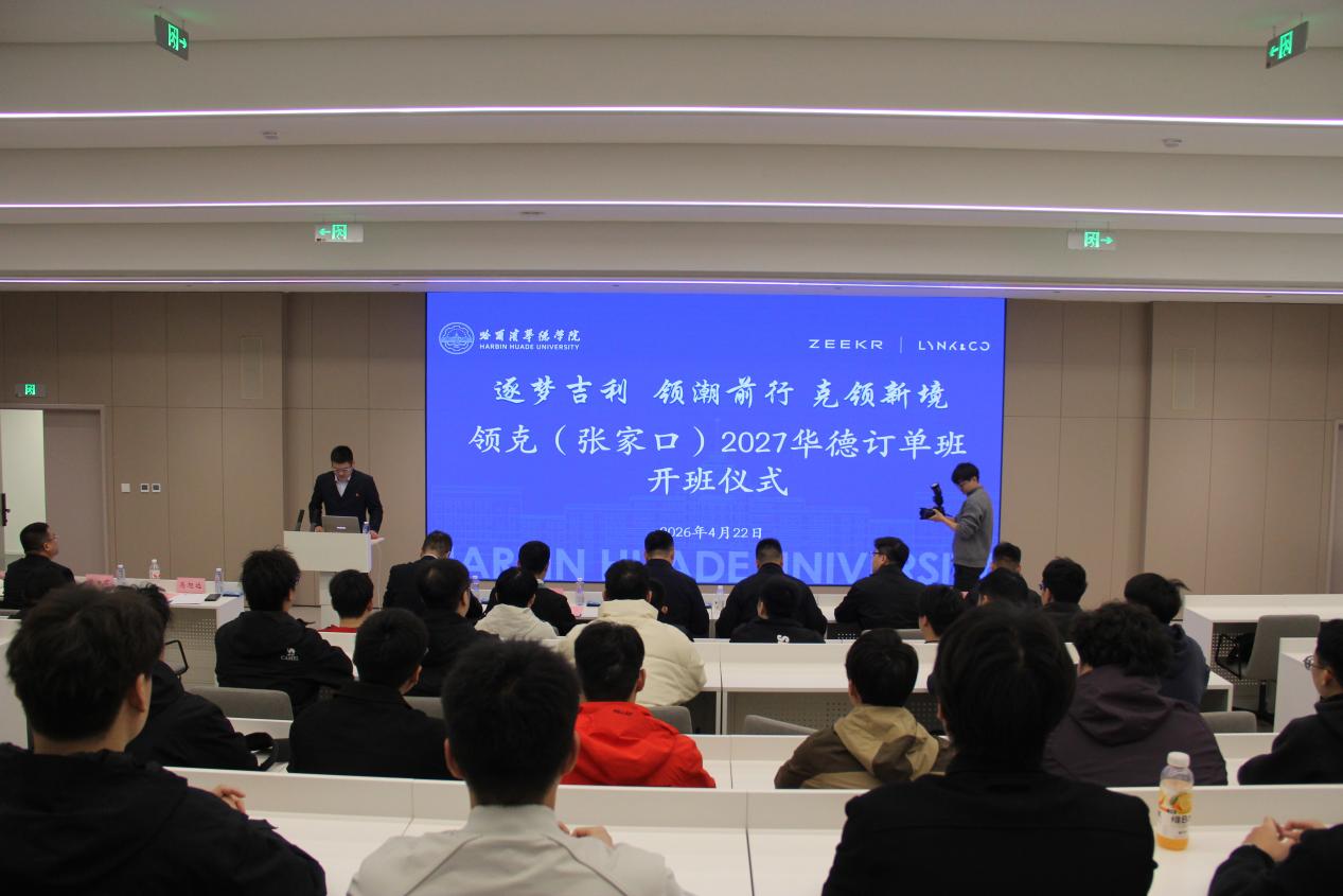 为深化产教融合、精准对接汽车产业智能化转型需求,定向培养高素质基层管理人才,2026年4月22日上午,领克汽车张家口工厂&哈尔滨华德学院2027届储备班组长项目开班仪式在学校教三四楼报告厅隆重举行。吉利集团人才经营总监刘瑜,领克汽车张家口工厂人才经营部高级经理刘洋、吉利集团人事经理谭刚、领克汽车张家口工厂校企合作经理吉文儒;哈尔滨华德学院校长李长威、数据科学与信息工程学院院长温海洋、汽车与建筑工程学院副院长宁士君,智能制造工程学院副院长郝亮等校企双方领导出席本次仪式。