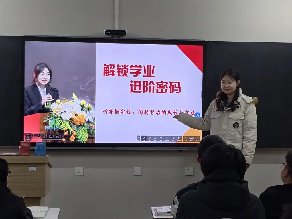 曾荣获国家奖学金的齐桐宇同学结合自身学习经历,从时间管理、课堂效率、竞赛与学业平衡三个方面展开分享。她不仅介绍了实用的笔记整理方法与复习策略,也坦诚分享了面对学习瓶颈时的心态调整经验,鼓励同学们既要脚踏实地夯实基础,也要勇于突破自我、积极探索。