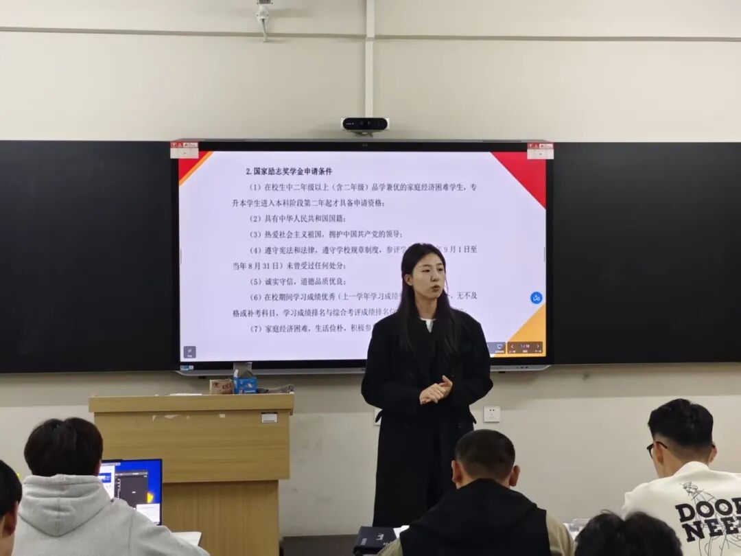 在政策解读环节,辅导员就同学们广泛关注的奖学金评定制度做了专项讲解,详尽解析了校级与国家奖学金各自的评选标准、申请流程及评审重点,引导同学们将争取奖学金的过程,内化为持续学习的动力,提前规划学业,明确“努力有所获”的成长方向。