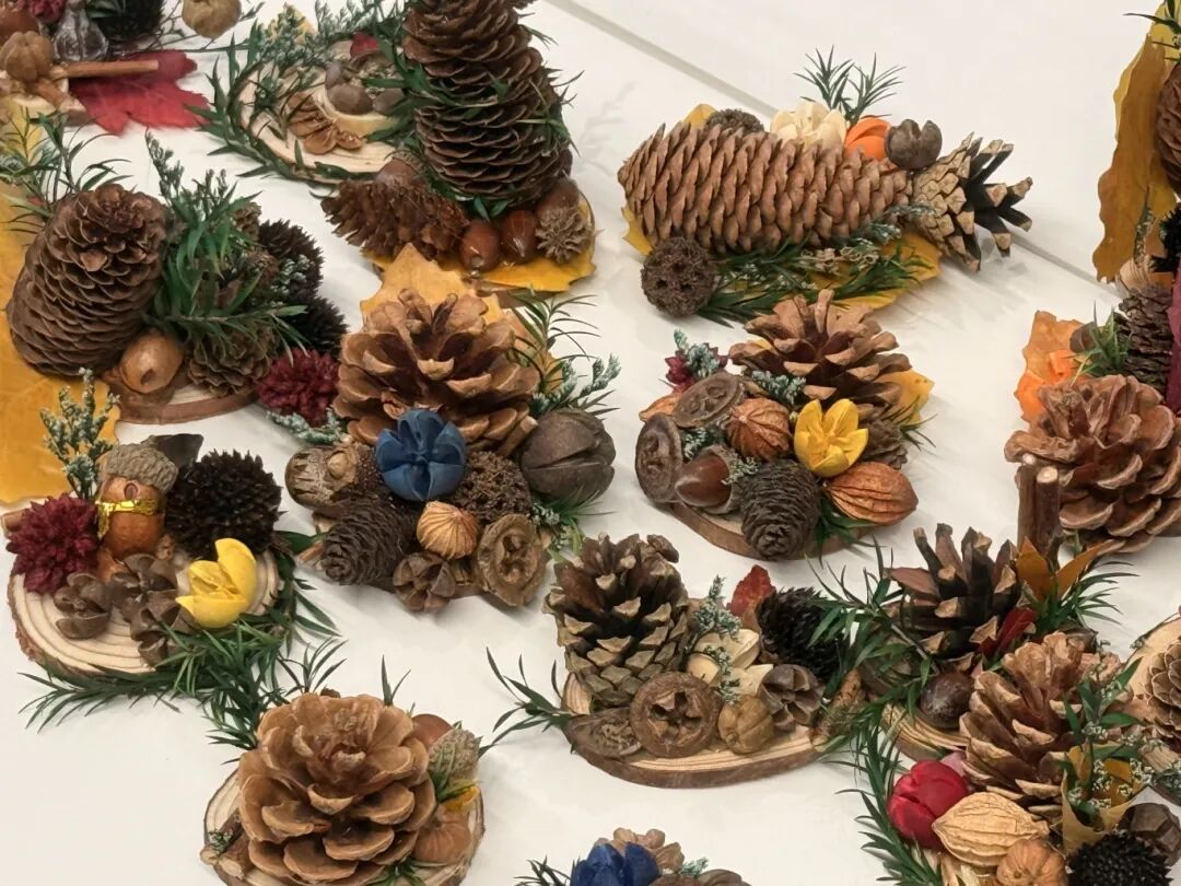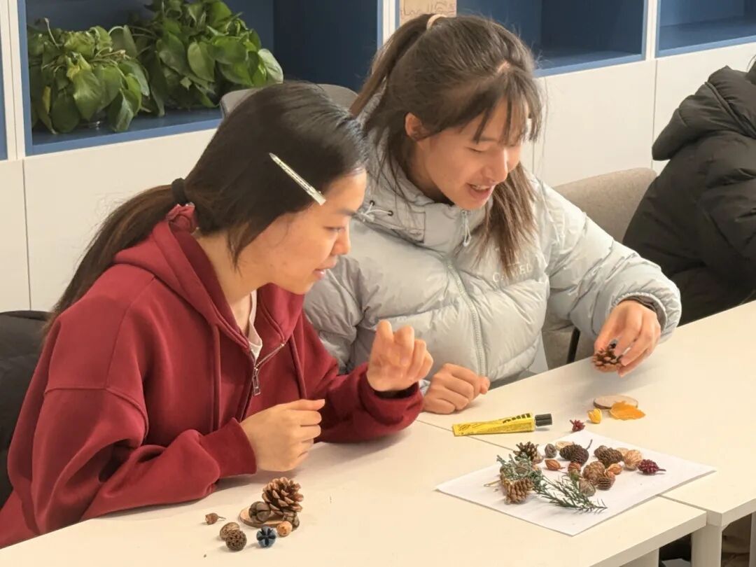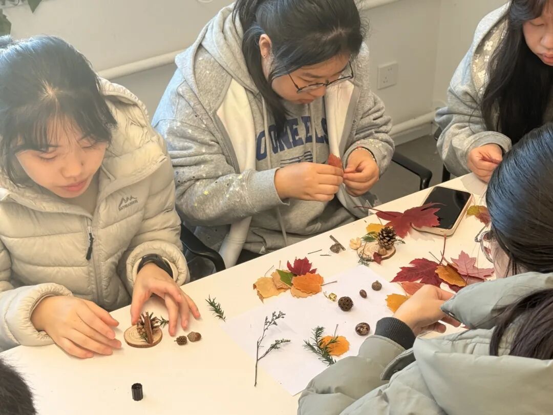 同学们化身为大自然的探索者,在校园中寻觅落叶、松果与种子,将自然的馈赠收集入怀。在创作环节中,同学们将一缕秋风、一片金黄定格于圆木之间,创作出一个个独一无二、充满个人情感记忆的手工冰箱贴。整个过程不仅是一次艺术创作,更是一次与自我对话的心灵疗愈旅程。