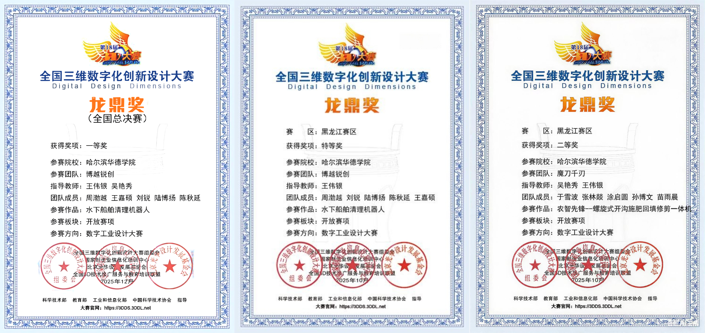 哈尔滨华德学院在今年的全国三维数字化创新设计大赛中表现卓越,荣获全国总决赛一等奖、黑龙江赛区省级特等奖与二等奖,展现了我校学子突出的创新能力和扎实的专业功底。