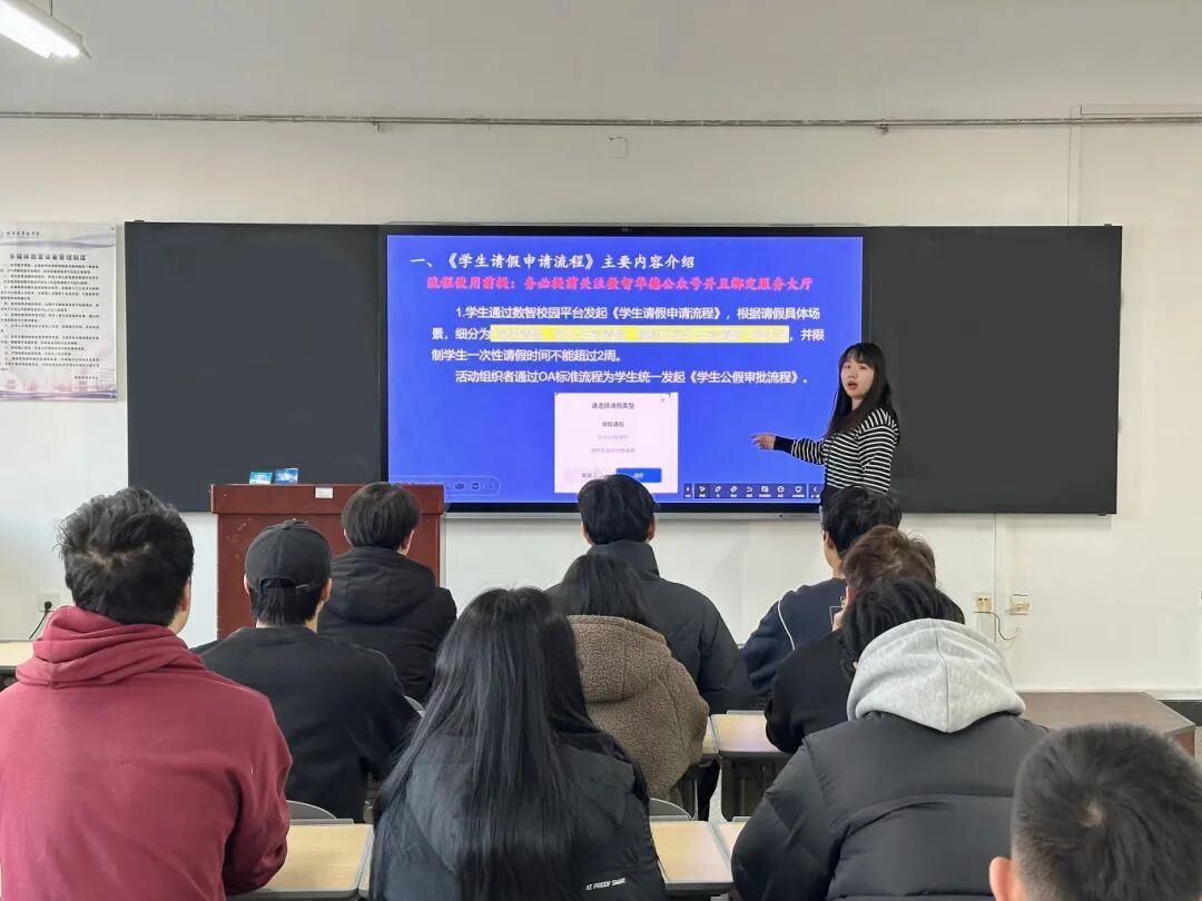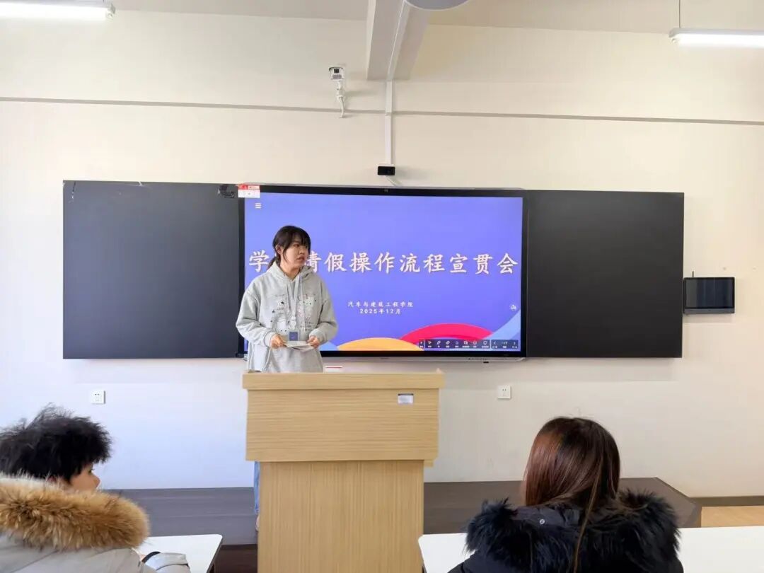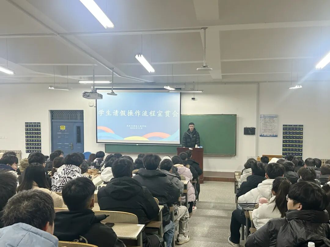 为保障新版学生请假流程顺利实施,提升学生管理工作规范化与信息化水平。近日,汽车与建筑工程学院组织全体辅导员,面向各年级学生开展新版请假流程专题宣贯会。