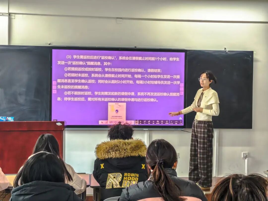 宣贯会上,辅导员依据《学生请假操作手册》,系统讲解了新版请假流程的核心要点、操作规范与注意事项,内容涵盖请假类型适用场景、线上申请具体步骤、审批流程节点逻辑及返校销假等关键环节。通过集中讲解与实操演示相结合的方式,帮助学生准确理解并掌握新流程的各项要求。