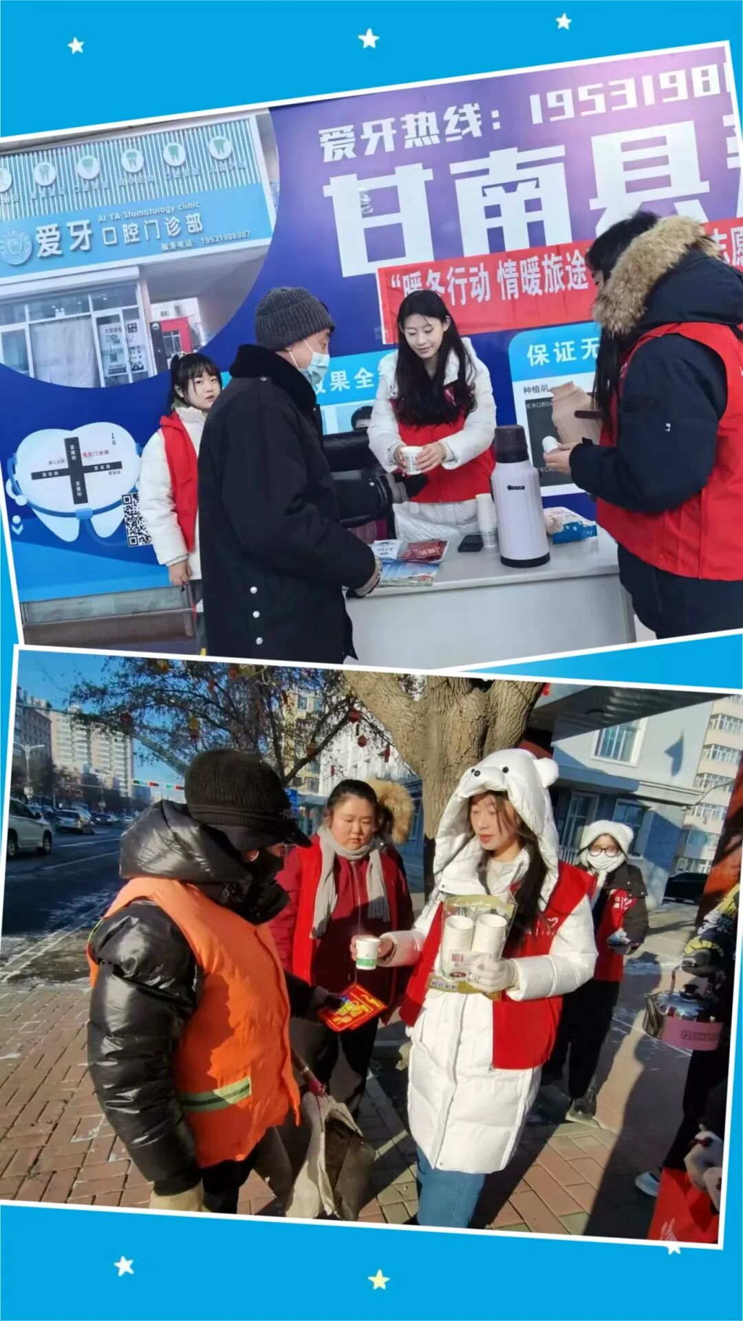 在火车站、汽车站及主要街道路口,团队搭建“青春暖冬驿站”,每日定时开放。为环卫工人、外卖骑手等户外工作者提供热水、暖贴、口罩及应急药品等,并设置临时休息点。一杯热茶、一句问候,让寒冷中坚守岗位的劳动者感受到来自城市的关心和关怀,用微小行动传递社会温暖。
