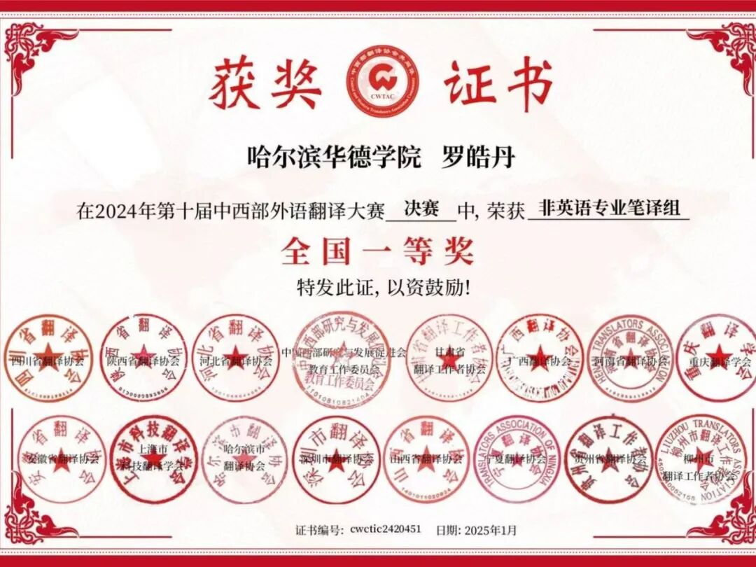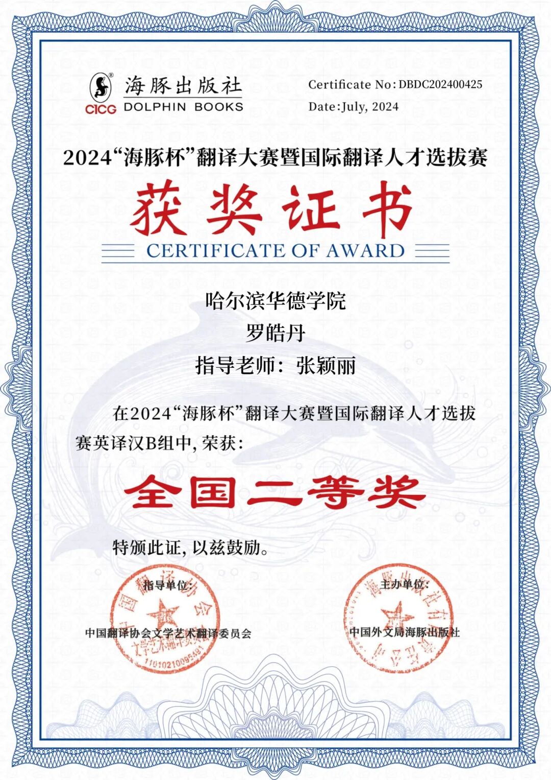罗皓丹同学始终秉持“勤耕不辍,笃行致远”的信念,在学业、竞赛与科研中不懈求索。她专注课业、精进不怠,学业成绩稳居前列,多次荣获国家及校级奖学金。在夯实专业基础的同时,她积极拓展能力边界,于跨领域赛事中屡创佳绩,先后获得第十届中西部翻译大赛全国一等奖、2024“海豚杯”翻译大赛全国二等奖、第三届全国大学生AI科技竞赛一等奖、第四届大学生就业能力大赛省赛一等奖等多项国家级和省级荣誉。她以赛促学、学研互进,不仅以第一作者身份发表学术论文,还主持完成黑龙江省大学生创新创业训练计划项目,展现出全面发展的综合素养与持续进取的卓越风采。